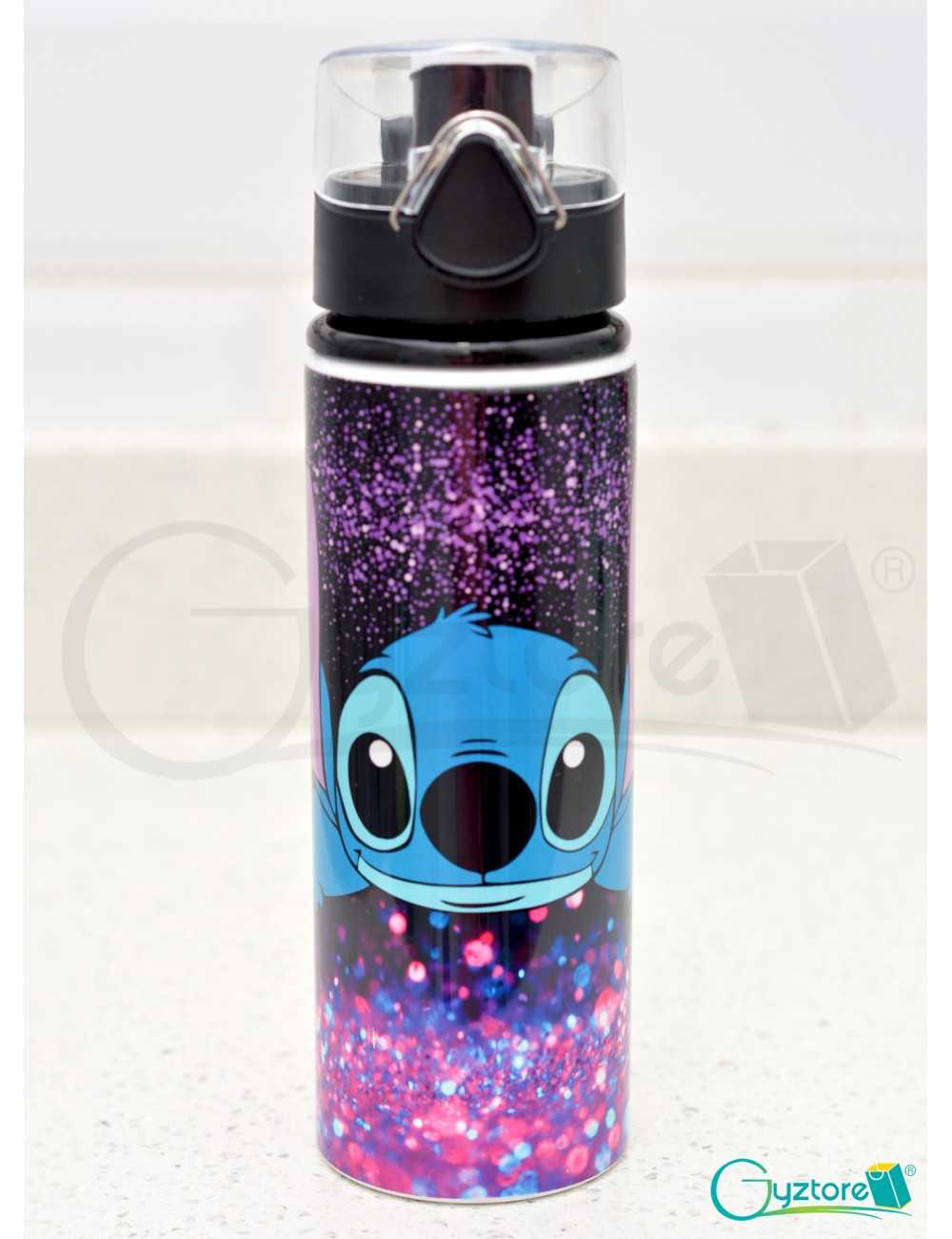Botella full Print diseño de Stitch, su diseño cubre toda la botella. La tapa se abre con un botón, el material es aluminio.